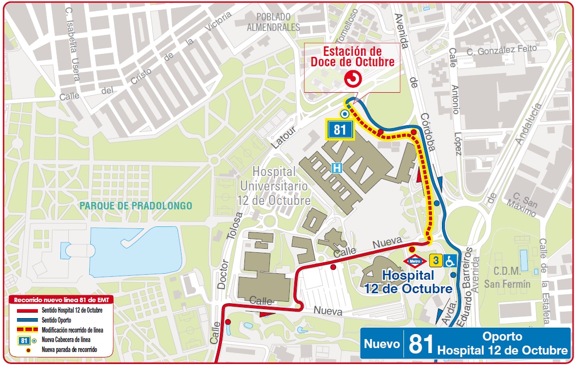 23 de enero de 2026.- A partir del lunes 26 de enero de 2026, las líneas 121 y N15 amplían su itinerario en el entorno del Hospital 12 de Octubre hasta la estación de Cercanías, y la línea 81, desviada por las obras de los viales de acceso del nuevo edificio de hospitalización, recuperará su recorrido original. Estas modificaciones permiten el acceso a la entrada principal del nuevo edificio de hospitalización, a Urgencias y al nuevo edificio principal, manteniendo la correspondencia con la estación de Metro, y añadiendo correspondencia con la red de Cercanías.