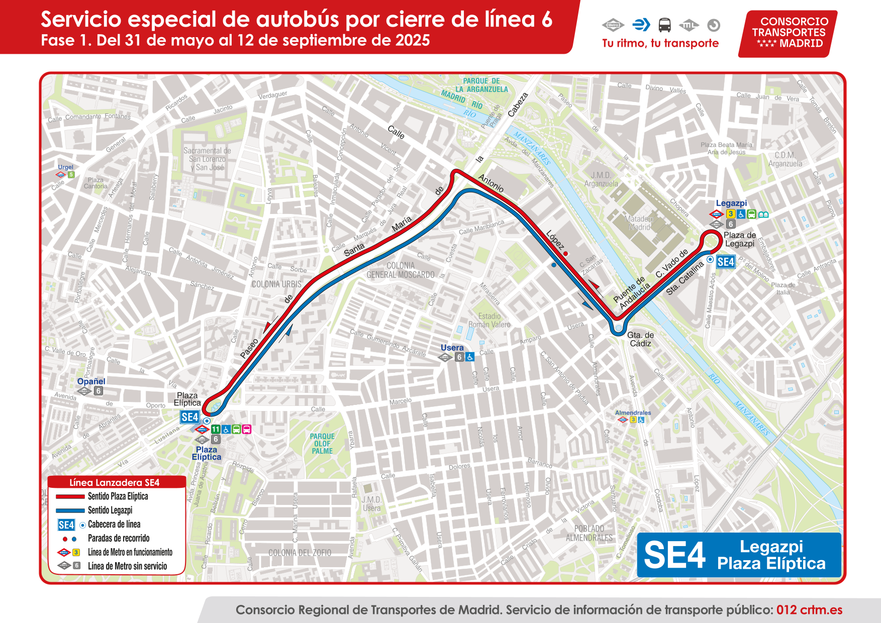 El SE6 circulará entre las cabeceras de Legazpi y Moncloa con una dotación de 53 autobuses (articulados y estándar).