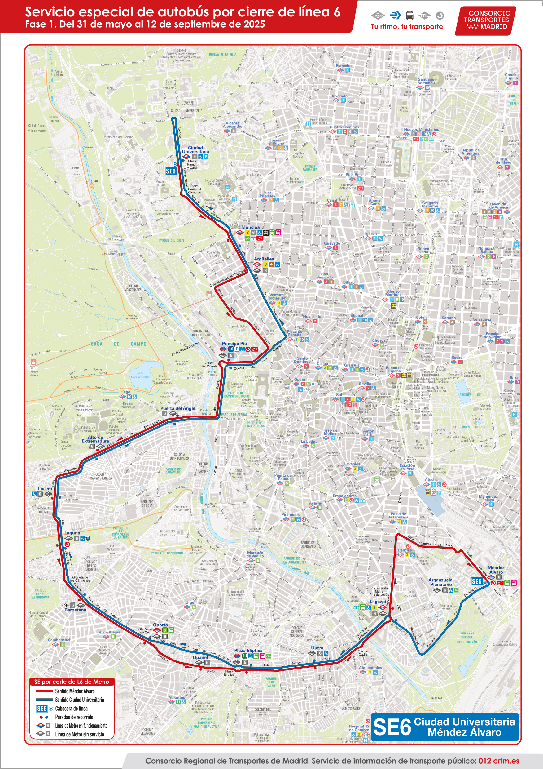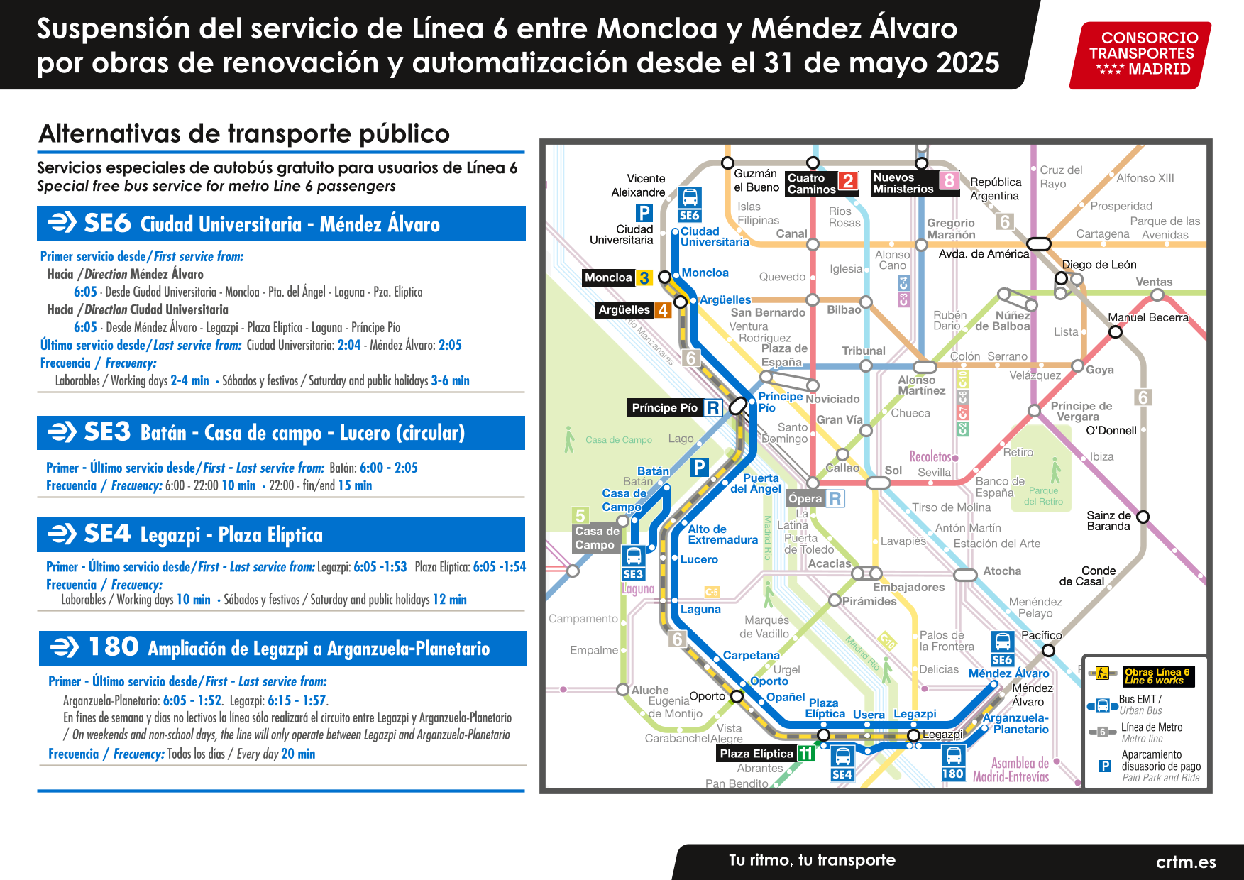Consulta el detalle de los servicios de autobuses -gratuitos para los usuarios de la línea 6- que cubrirán el recorrido en superficie.