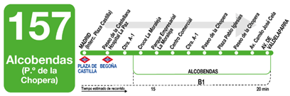Un ejemplo: si utilizas la línea 157 para ir desde la primera parada del Paseo de la Chopera hasta la Av. Camilo José Cela, tu billete te costará 1,5€. Sin embargo, si en la misma línea tu trayecto es desde la Plaza de Castilla hasta el Paseo de la Chopera, tu sencillo tendrá un precio de 3€, pues recorre dos municipios diferentes, Madrid y Alcobendas.