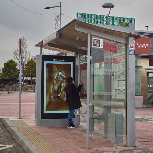 Los códigos NaviLens sirven para ayudar a las personas con discapacidad visual a localizar una parada de autobús y para obtener información sobre los tiempos de llegada de los próximos autobuses interurbanos del CRTM.