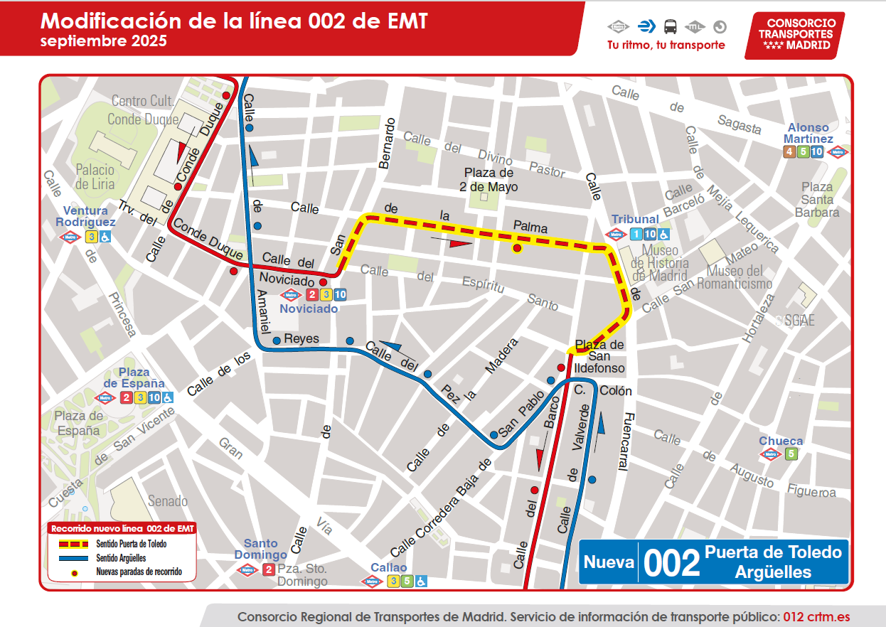 9 de septiembre de 2025.- Con motivo de la peatonalización de la Plaza del Rastrillo, desde el día 10 de septiembre de 2025 la línea de minibús 002 de EMT Puerta de Toledo – Argüelles, modifica su itinerario en sentido Puerta de Toledo, con nuevo trazado por las calles La Palma, Fuencarral, San Joaquín y plaza de San Ildefonso a su ruta habitual.