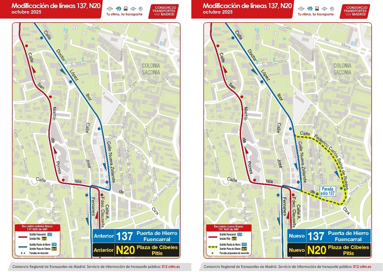 23 de octubre de 2025.- La línea 137 sentido Ciudad Puerta de Hierro y la línea N20 sentido Plaza de Cibeles modifican su recorrido y, en lugar de circular por la calle Nueva Zelanda, continuarán su itinerario por la avenida de Juan Andrés y calle de Federico Carlos Sainz de Robles, para recuperar después su itinerario habitual por la calle de la Isla de Oza.